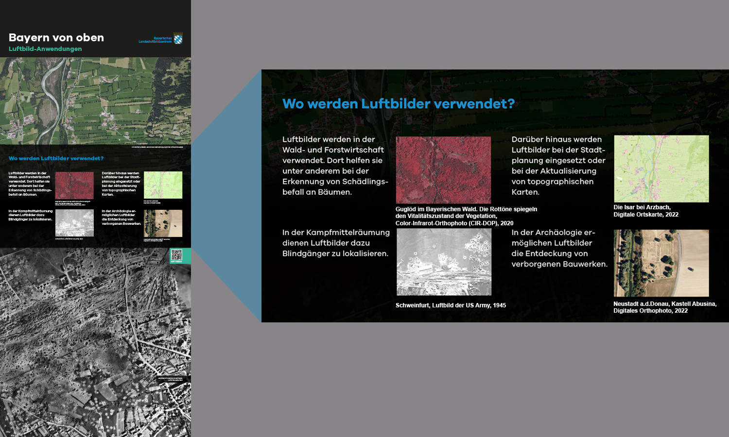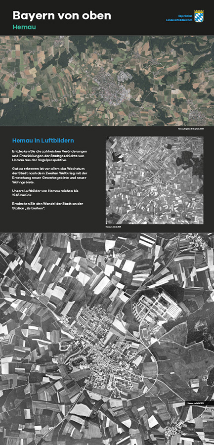 Anlässlich des fünfjährigen Bestehens des Bayerischen Landesluftbildzentrums stellte die Wanderausstellung dessen Angebote einem breiten Publikum vor. Die multimedial gestaltete und leicht verständlich aufbereitete Ausstellung vermittelt einen spannenden Einblick in die Geschichte und Technik der Luftbildfotografie. Auf 14 Ausstellungstafeln wurde den Besucherinnen und Besuchern gezeigt, wie Luftbilder gemacht werden, wie sie aufbereitet werden und wo sie eingesetzt werden.